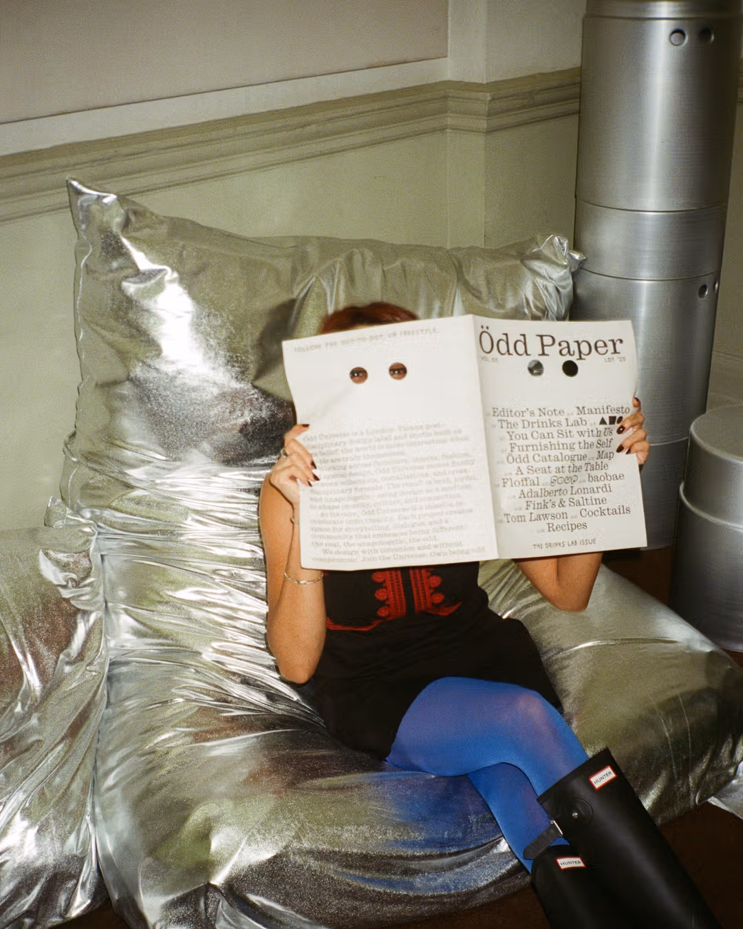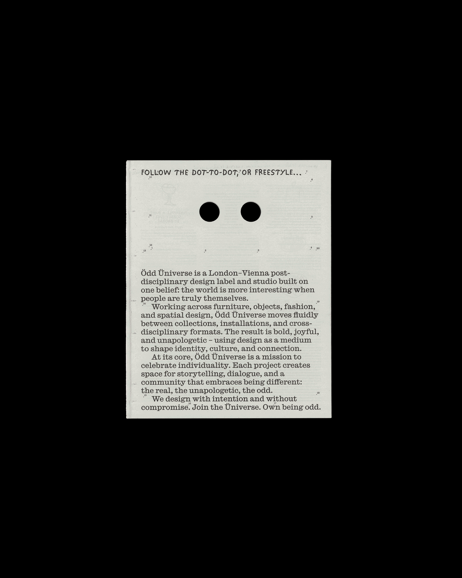 The paper is punched through with two eye holes, inspired by Ödd Üniverse’s ‘Peepers’ stools and branding. Part catalogue, part cultural editorial, the newspaper assembled essays, recipes and reflections on design as a mindset – a printed extension of the Ödd Üniverse itself.